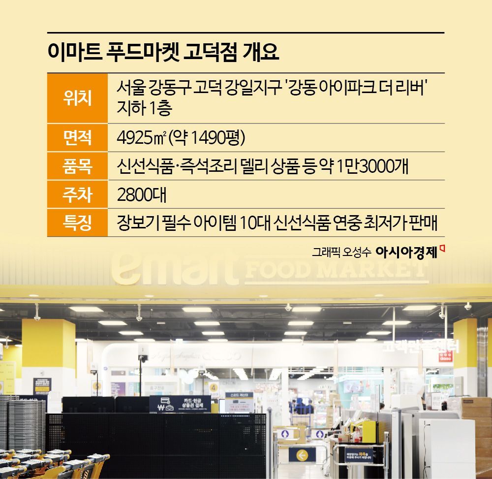 고덕점은 지난해 12월 문을 연 대구 수성점에 이은 이마트의 두 번째 푸드마켓이다. 강동 아이파크 더리버 지하 1층에 4925㎡(약 1490평) 규모로 터를 잡은 이곳은 입점 매장(테넌트)을 제외한 직영 면적의 95%(3471㎡·약 1050평)를 식료품으로 채웠다. 신선식품과 즉석조리 식품(델리) 등 1만3000여개 상품을 갖췄다. 이마트 매장 가운데 가장 많은 개수다. 오프라인 매장의 장점을 극대화한 특화존만 21개에 달한다.