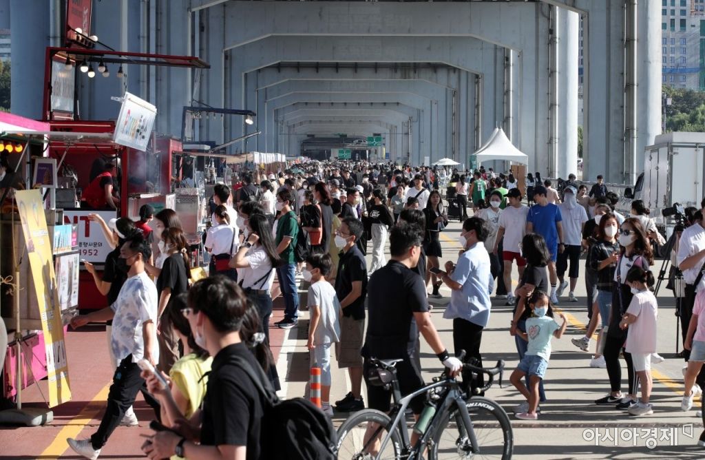 18일 서울 잠수교에서 열린 '2022 차 없는 잠수교 뚜벅뚜벅 축제'가 시민들로 붐비고 있다. 10월30일까지 매주 일요일마다 운영되는 이번 축제는 플리마켓, 거리공연, 푸드트럭, 야외 영화관 등 다채로운 프로그램을 선보인다./김현민 기자 kimhyun81@