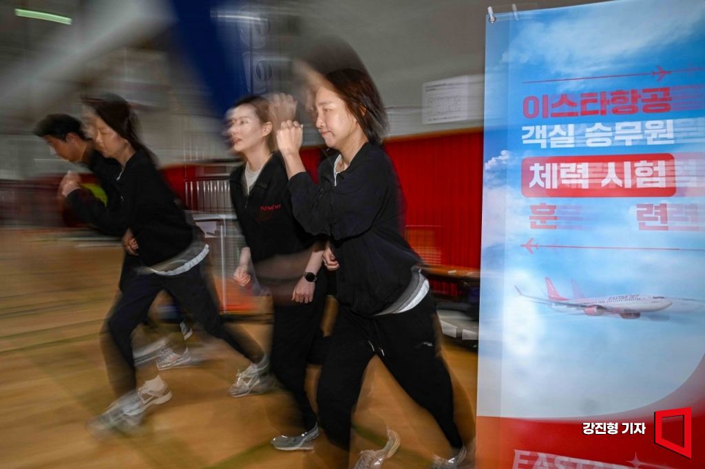이스타항공 승무원들이 17일 서울 마포구 체력인증센터에서 첫 체력 시험 도입을 앞두고 체력 측정 및 훈련을 실시하고 있다. 이스타항공은 오는 23일부터 기내 안전 요원으로서의 역량 증진을 위해 신입 승무원들의 첫 체력 시험 전형을 치를 예정이다.