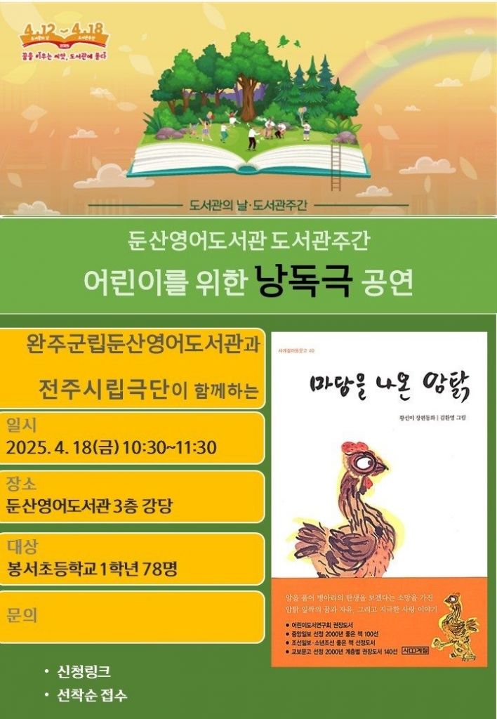 전북 완주군립 둔산영어도서관은 오는 18일 강당에서 도서관 주간을 맞아 어린이를 위한 낭독극 '마당을 나온 암탉' 공연이 열린다고 17일 밝혔다.