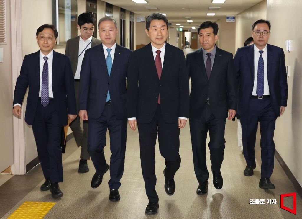 이주호 부총리 겸 교육부 장관을 비롯해 양오봉, 이해우 의과대학 총장협의회 회장 등 참석자들이 17일 서울 종로구 정부서울청사에서 열린 2026학년도 의대 모집인원 조정 방향 브리핑에 참석하고 있다.