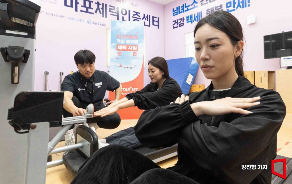 이스타항공 승무원들이 17일 서울 마포구 체력인증센터에서 첫 체력 시험 도입을 앞두고 체력 측정 및 훈련을 실시하고 있다. 이스타항공은 오는 23일부터 기내 안전 요원으로서의 역량 증진을 위해 신입 승무원들의 첫 체력 시험 전형을 치를 예정이다.
