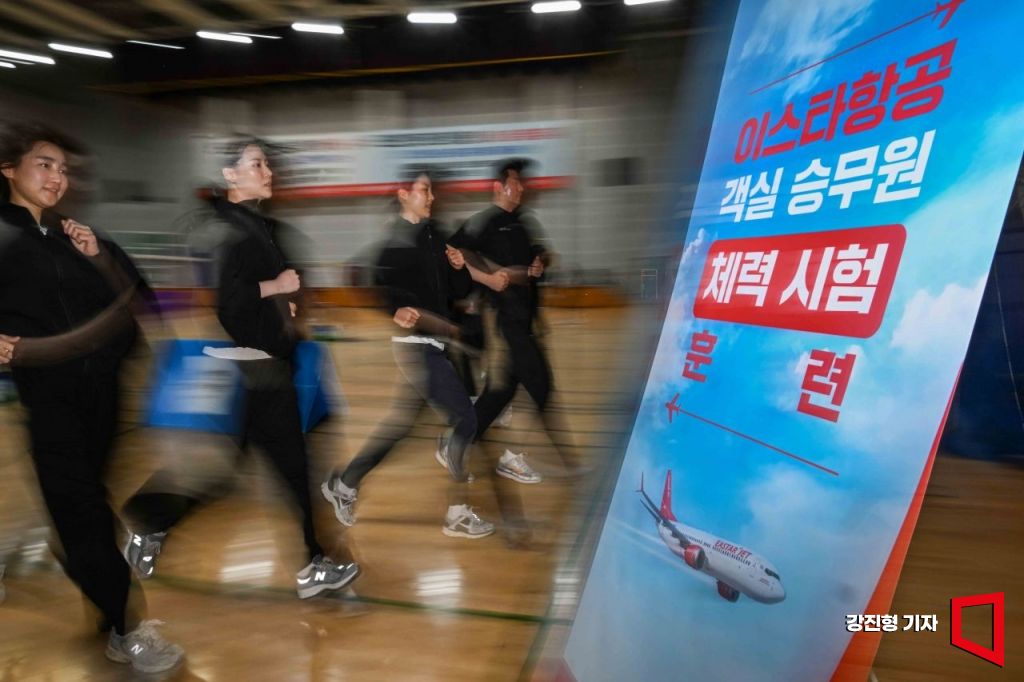 이스타항공 승무원들이 17일 서울 마포구 체력인증센터에서 첫 체력 시험 도입을 앞두고 체력 측정 및 훈련을 실시하고 있다. 이스타항공은 오는 23일부터 기내 안전 요원으로서의 역량 증진을 위해 신입 승무원들의 첫 체력 시험 전형을 치를 예정이다.