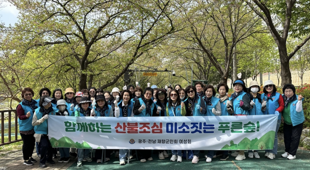 광주·전남 재향군인회 여성회(노향자 회장)가 17일 오전 광주 양산호수공원 일대에서 환경정화 및 산불 예방 캠페인을 벌이고 있다. 이들은 '향군 Go! Go! Go! 캠페인'의 일환으로 산책로 주변 쓰레기를 수거하고, 산불 조심 피켓을 든 채 시민들에게 예방을 당부했다. 재향군인회 제공
