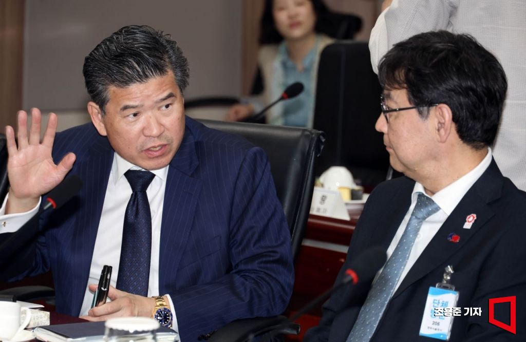 제임스 김 주한미국상공회의소 회장(왼쪽)이 17일 서울 종로구 정부서울청사에서 열린 주한외국상공회의소 임원 정책 간담회에 참석 대화를 하고 있다.