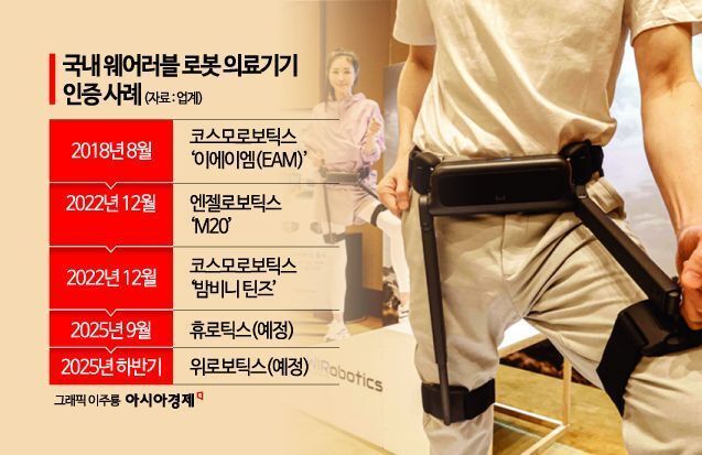 웨어러블 로봇의 의료기기 인증은 2018년 8월 코스모로보틱스(당시 엑소아틀레트)의 '이에이엠(EAM)'이 식품의약품안전처로부터 최초 승인을 받으며 시작됐다. 이후 2022년 12월 엔젤로보틱스의 'M20'이 처음으로 3등급 인증을 받았고, 같은 달 코스모로보틱스의 아동용 로봇 '밤비니 틴즈'도 같은 등급을 획득했다. 현재 인증을 준비 중인 휴로틱스와 위로보틱스는 이보다 높은 2등급을 목표로 하고 있다. 식약처의 의료기기 등급은 1~4등급으로 나뉘며, 잠재적 위해성에 따라 분류된다.