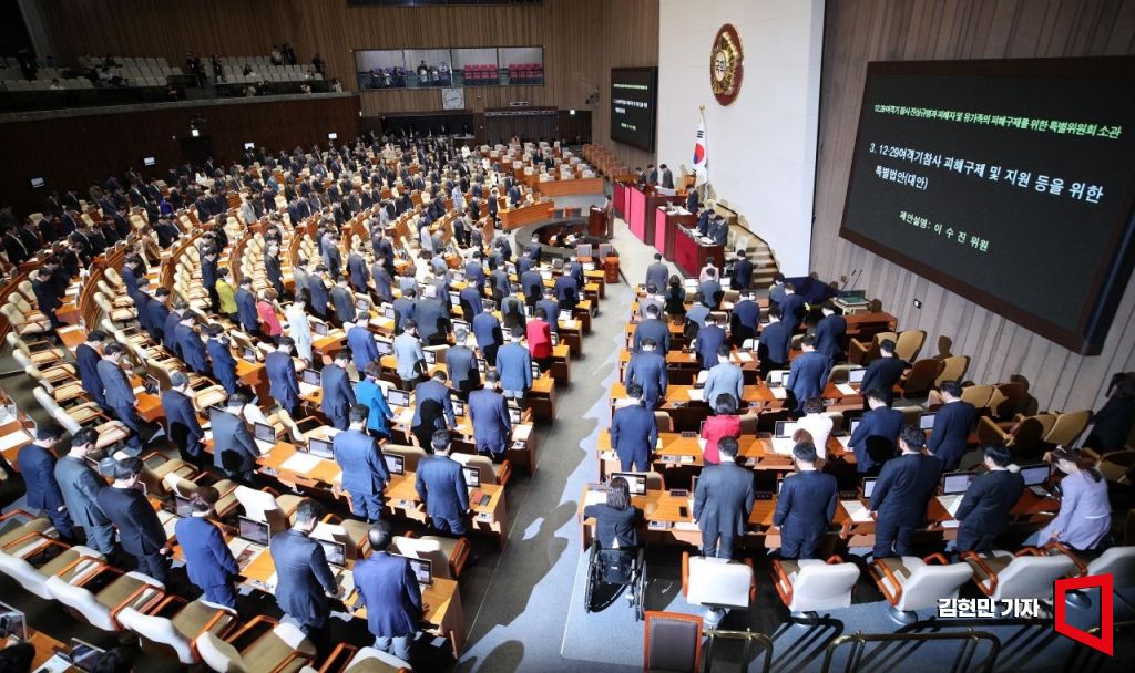 17일 국회 본회의에서 의원들이 12·29 여객기 참사 피해구제 및 지원 등을 위한 특별법 표결에 앞서 법안 제안설명에 나선 더불어민주당 이수진의 의원의 제안에 따라 희생자를 추모하며 묵념하고 있다.