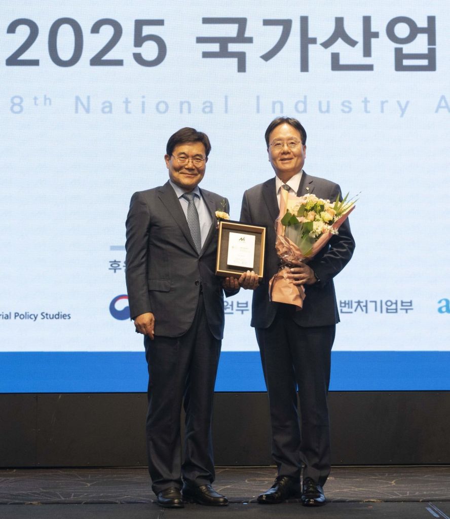 S-OIL 이영호 영업전략부문장(오른쪽)이 17일 열린 2025 국가산업대상 시상식에서 산업정책연구원 박기찬 원장과 수상기념 촬영을 하고 있다.