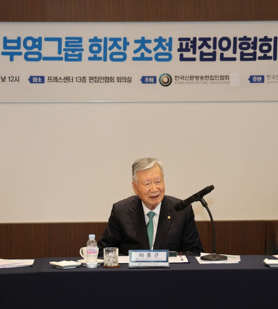 이중근 부영그룹 회장(가운데)이 16일 서울 중구 프레스센터에서 열린 편집인협회 포럼에서 강연하고 있다. 부영그룹 제공