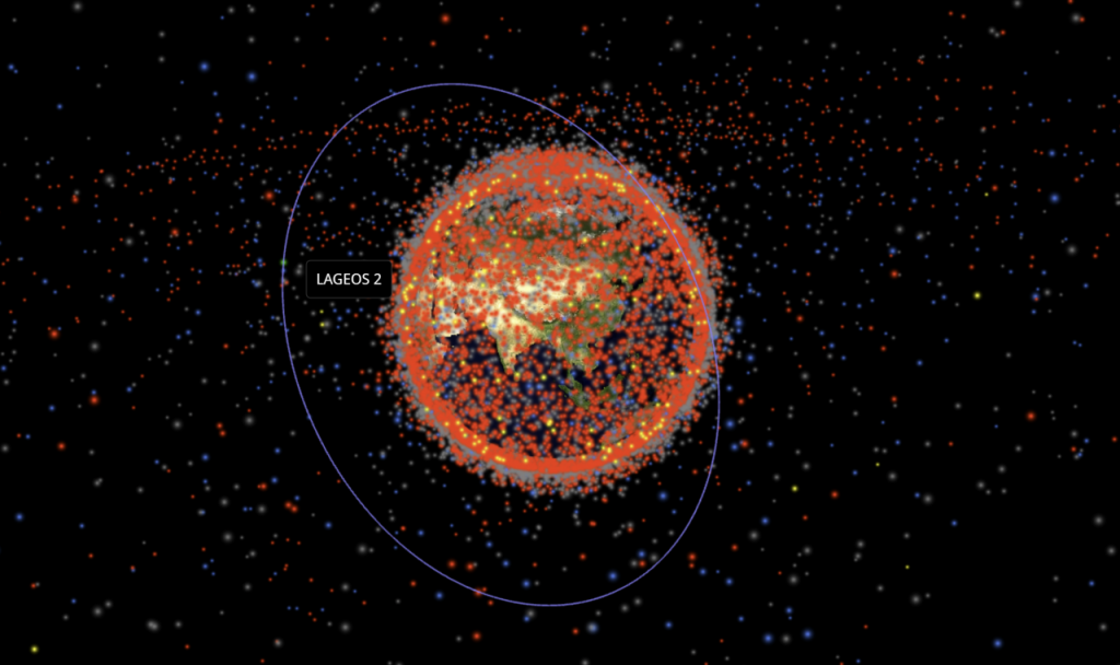 지구 주위를 돌고 있는 위성의 모습을 3D로 표현한 그림. 위성과 우주 쓰레기들이 모두 포함돼 있다. 파란선은 한 위성의 궤도를 표시한 것이다. 정상 궤도에서 벗어나거나 갑자기 지구로 떨어지는 궤도붕괴 위성이 발생하는 이유 중 하나가 우주 쓰레기와의 충돌이다. 로그 스페이스 시스템스(Rogue Space Systems) 제공.