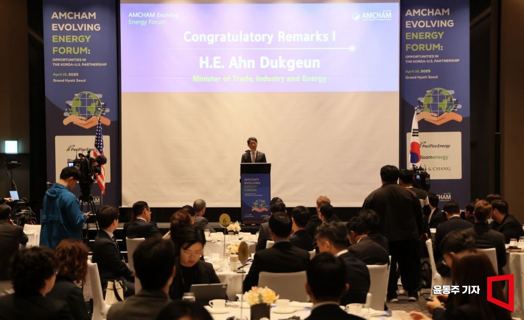 안덕근 산업통상자원부 장관이 18일 서울 용산구 하얏트호텔에서 열린 암참 에너지 세미나에 참석, 인사말을 하고 있다.