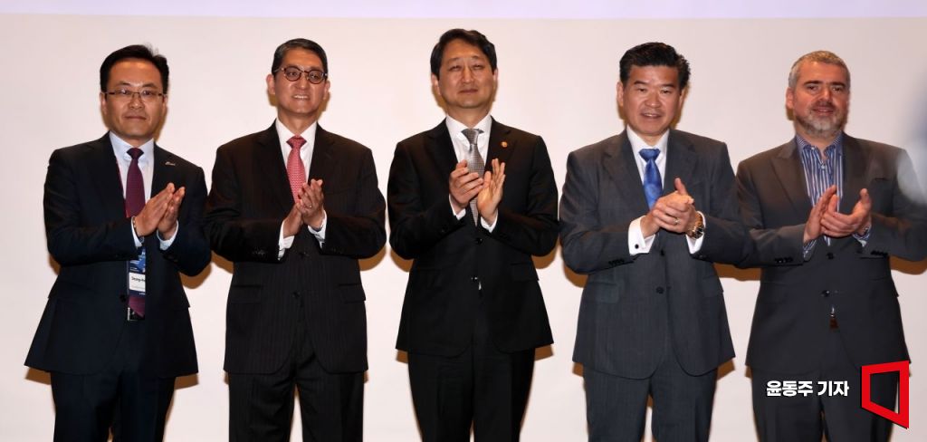 18일 서울 용산구 하얏트호텔에서 열린 암참 에너지 세미나에 참석한 안덕근 산업부 장관(왼쪽 3번쨰부터)과 제임스 김 암참 회장 등 주요 참석자들이 행사 시작에 앞서 기념촬영을 하고 있다.