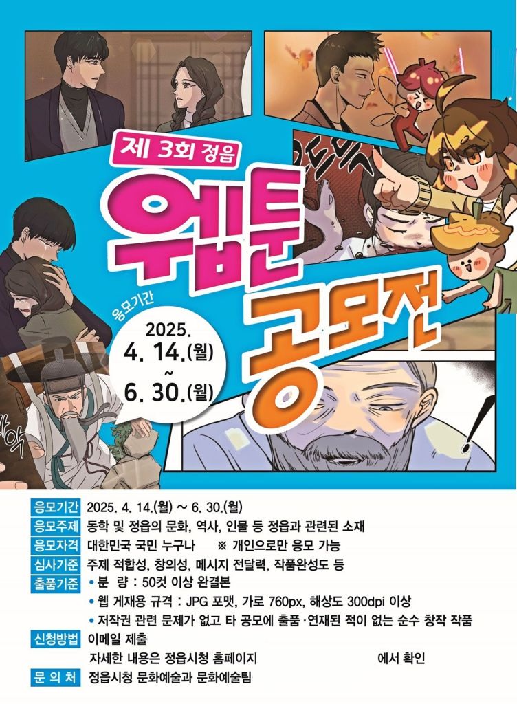 접수는 오는 6월 30일까지 이메일을 통해 가능하며 50컷 이상의 완결본 웹툰(JPG 파일, 가로 760px, 해상도 300dpi 이상)을 제출해야 한다. 자세한 사항은 시청 홈페이지 또는 정읍시 문화예술과로 문의하면 된다.