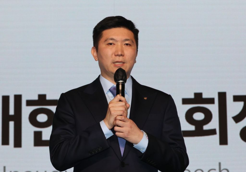 유승민 대한체육회장이 지난달 27일 서울 용산구 그랜드 하얏트 호텔에서 열린 제42대 대한체육회장 취임식에서 취임사를 하고 있다. [사진 제공= 연합뉴스]