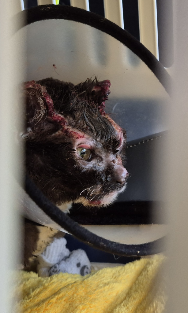지난 3일 경북 안동에서 발견한 고양이 영돌이를 구조하기 전 찍은 사진. 네 발바닥이 화상으로 벗겨지는 바람에 불길을 피하지 못했다. 사진=동물행동권 카라
