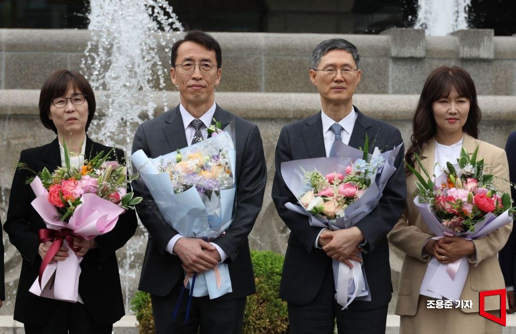 [포토] 퇴임 기념촬영하는 문형배, 이미선 재판관