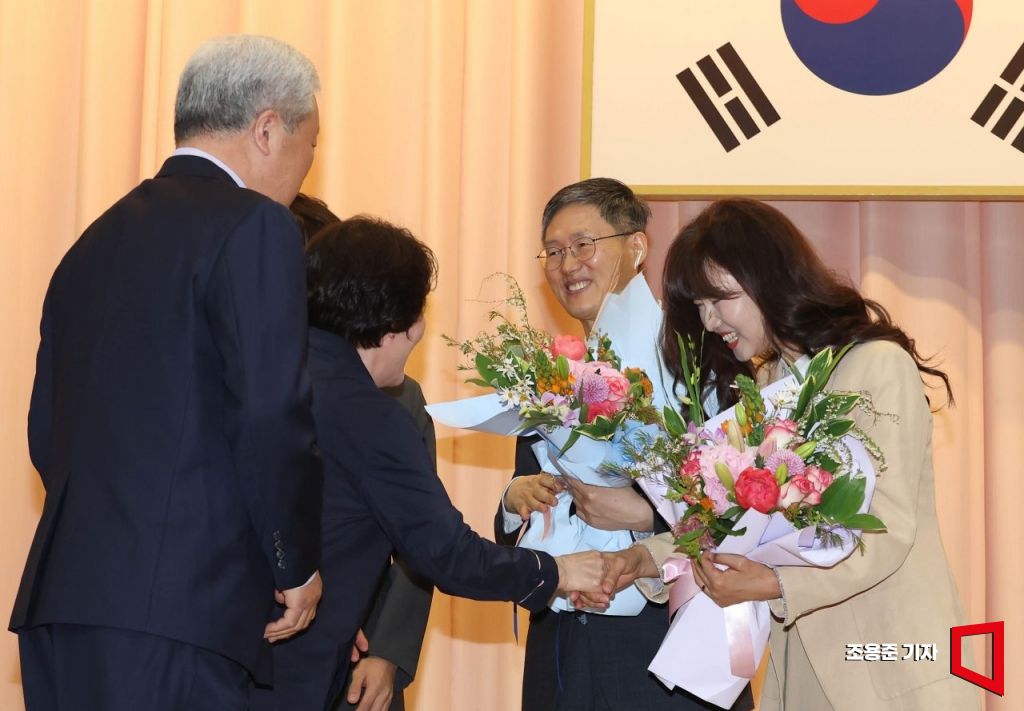 문형배 헌법재판소장 권한대행이 6년의 임기를 마치고 퇴임한 18일 서울 종로구 헌법재판소 대강당에서 가족들로 부터 꽃다발을 받고 있다.
