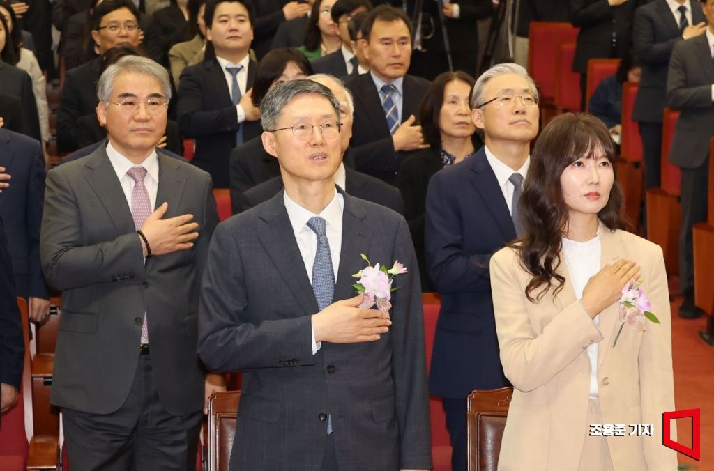 문형배 헌법재판소장 권한대행이 18일 서울 종로구 헌법재판소에서 열린 퇴임식에 참석, 국민의례를 하고 있다.