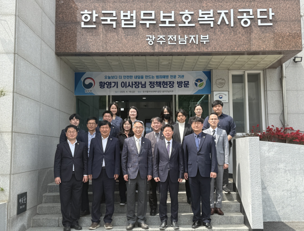 황영기 한국법무보호복지공단 이사장이 광주전남지부를 방문해 주요 관계자들과 기념촬영을 하고 있다.