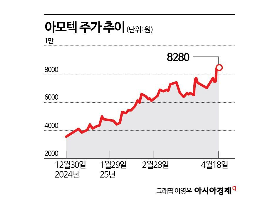 21일 금융투자업계에 따르면 아모텍 주가는 올해 들어 121.7% 올랐다. 지난해 말 3735원으로 거래를 마친 뒤 4개월 만에 8280원으로 뛰었다. 이 기간 코스닥 지수가 5.8% 오른 것을 고려해도 시장 대비 수익률은 115.9%포인트를 기록했다.