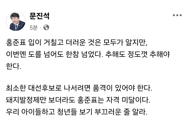 18일 더불어민주당 문진석 국회의원은 국민의힘 홍준표 전 대구시장이 이재명 전 대표의 도덕성을 지적한 것을 두고 "돼지 발정제만 봐도 홍준표는 자격 미달"이라고 비판했다.
