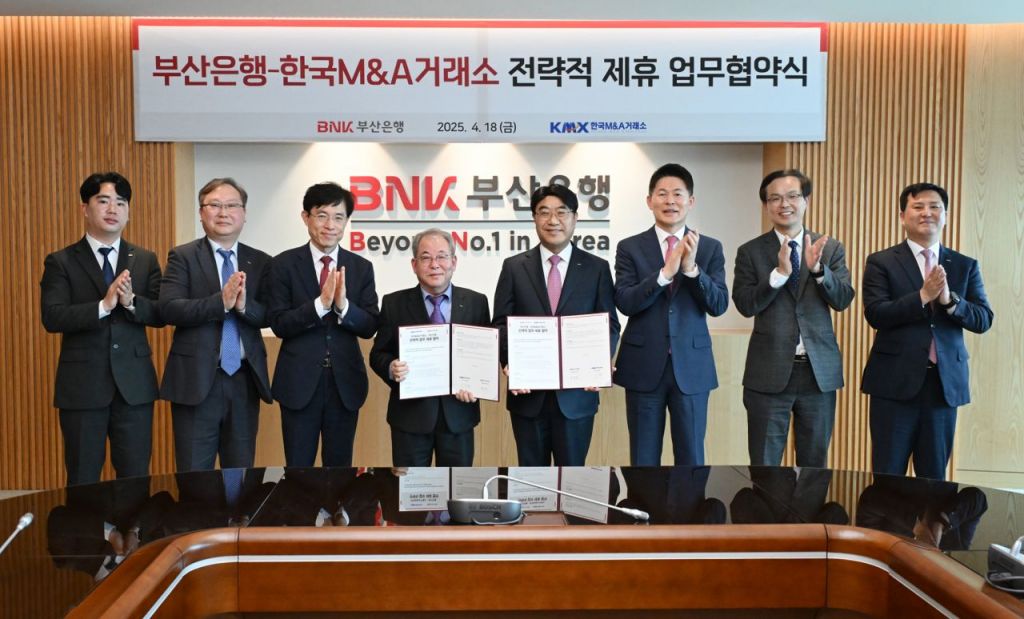 BNK부산은행(은행장 방성빈)은 18일 오후, 본점에서 국내 중소·중견 기업 인수합병 전문기관인 한국 M&A 거래소와 상호 간 협력체계 구축을 위한 전략적 업무협약(MOU)을 체결했다.