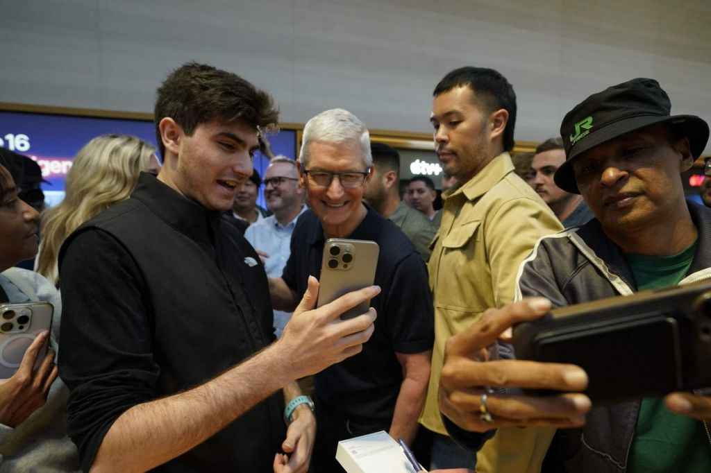 팀 쿡 애플 최고경영자(CEO)가 지난해 9월 20일 뉴욕에서 열린 아이폰16 론칭 행사에서 고객들과 기념촬영을 하고 있다. AFP연합뉴스