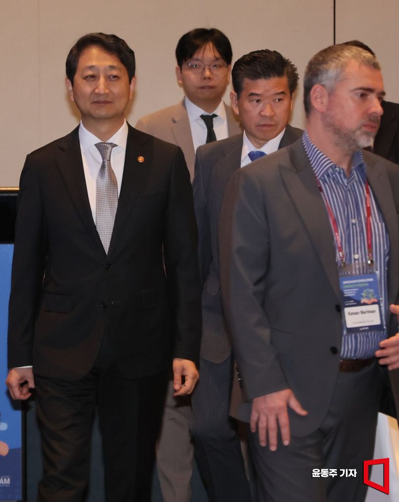 18일 서울 용산구 하얏트호텔에서 열린 암참 에너지 세미나에 안덕근 산업부 장관(왼쪽)과 제임스 김 암참 회장이 참석하고 있다. 2025.04.18 윤동주 기자