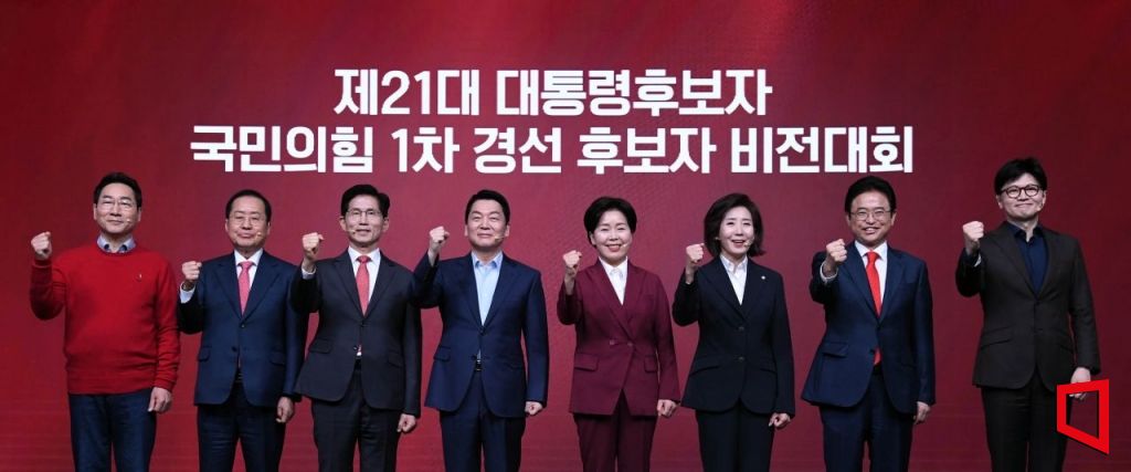 18일 서울 강서구 ASSA아트홀에서 열린 '제21대 대통령후보자 국민의힘 1차 경선 후보자 비전대회' 에 참석한 후보들이 기념촬영 하고 있다. 왼쪽부터 유정복, 홍준표, 김문수, 안철수, 양향자, 나경원, 이철우, 한동훈 후보. 2025.4.18 국회사진기자단