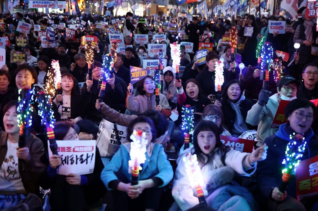 헌법재판소가 윤석열 대통령 파면을 선고한 지난 4일 광주 동구 5·18민주광장에서 열린 광주시민 승리대회에서 시민들이 피켓을 들어올리며 구호를 외치고 있다. 연합뉴스