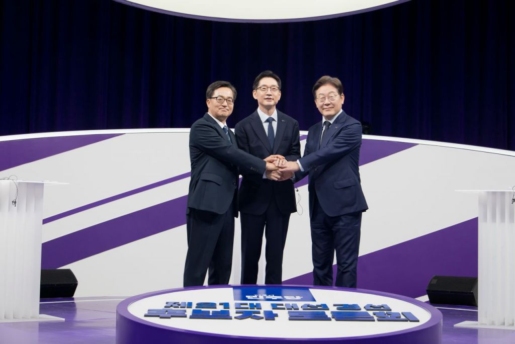 더불어민주당 대선 경선 주자인 이재명·김경수·김동연 후보가 18일 서울 마포구 상암동 MBC에서 첫 TV토론회를 시작하기에 앞서 기념촬영 하고 있다. 연합뉴스