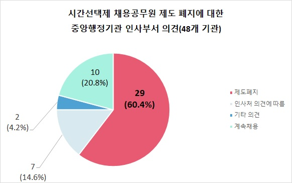 4월 15일 전국시간선택제공무원노동조합(위원장 정성혜)에서 올 3월 18일 중앙행정기관 인사부서를 대상으로 2014년 도입된 '시간선택제 채용공무원의 '계속 채용 또는 제도 폐지에 관하여 설문조사를 한 결과 회신한 48개 기관 중 29개(60.4%) 기관이 '제도 폐지'를 희망하고 7개(14.2%) 기관이 '인사혁신처 제도 개선 방안에 따르겠다'고 응답했다.