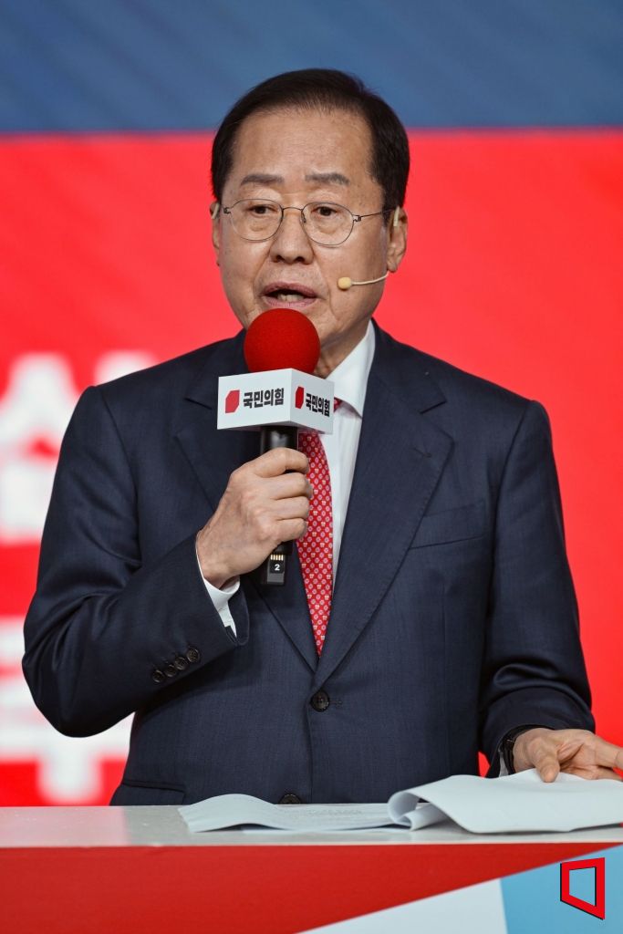 18일 서울 강서구 ASSA 아트홀에서 열린 ‘제21대 대통령 후보자 국민의힘 1차 경선 후보자 비전대회’에서 홍준표 후보가 비전발표를 하고 있다. 2025.04.18. 국회사진기자단