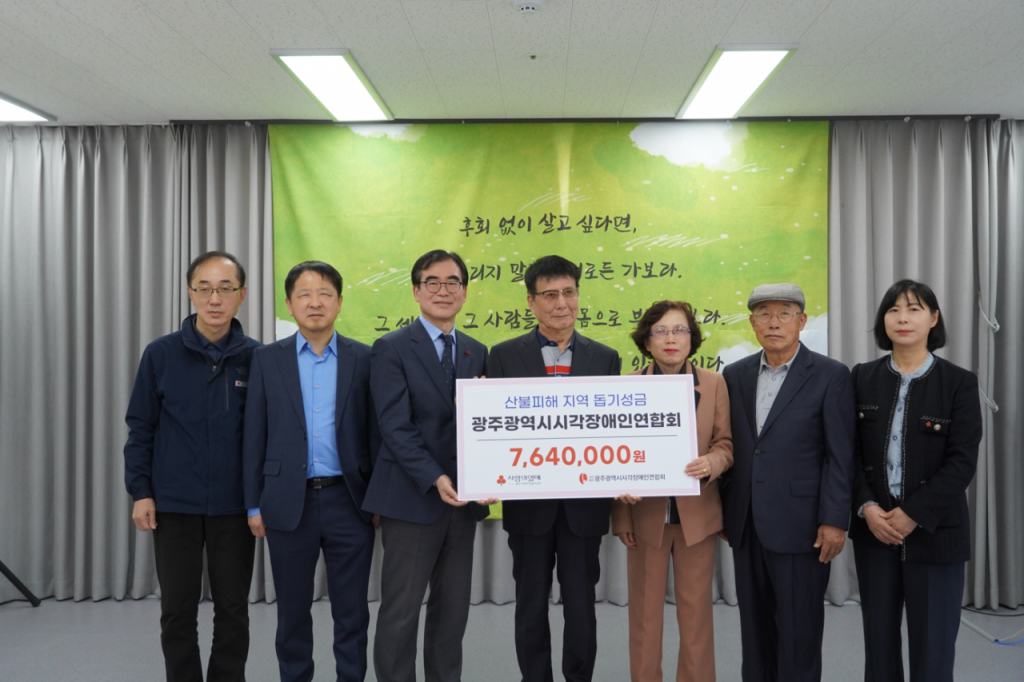 광주시시각장애인연합회가 최근 산불 피해 지역을 돕기 위해 성금 764만원을 기탁했다. 광주사회복지공동모금회 제공