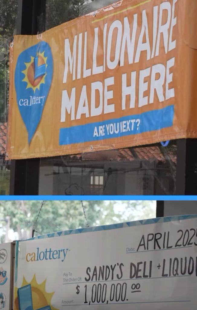 100만달러 복권 당첨 소식을 알리는 플래카드가 샌디스 델리 리커 앞에 걸려있다. 사회관계망서비스(SNS) 캡처