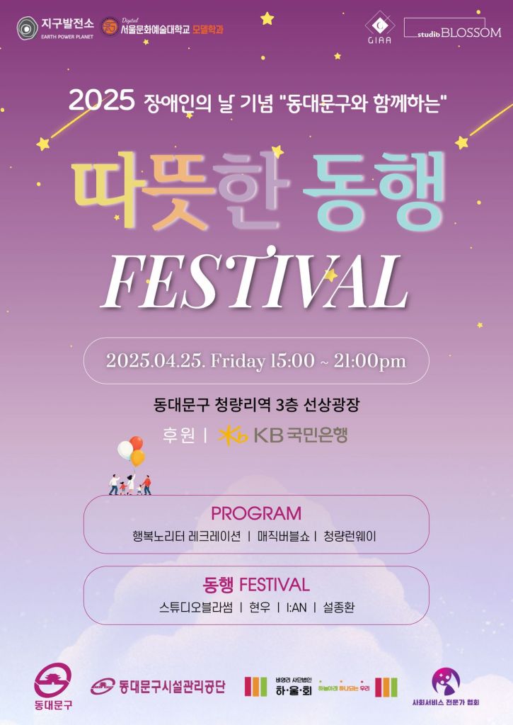 동대문구(구청장 이필형)가 4월 25일 장애인의 날을 맞아 오후 3시부터 9시까지 청량리역 3층 선상광장에서 '2025 따뜻한 동행 페스티벌'을 연다.