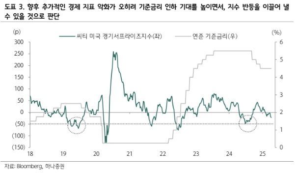 하나증권은 미국의 부진한 경제지표가 기준금리 인하 기대감을 끌어올리면서 지수 반등까지 이어질 수 있을 것으로 내다봤다.