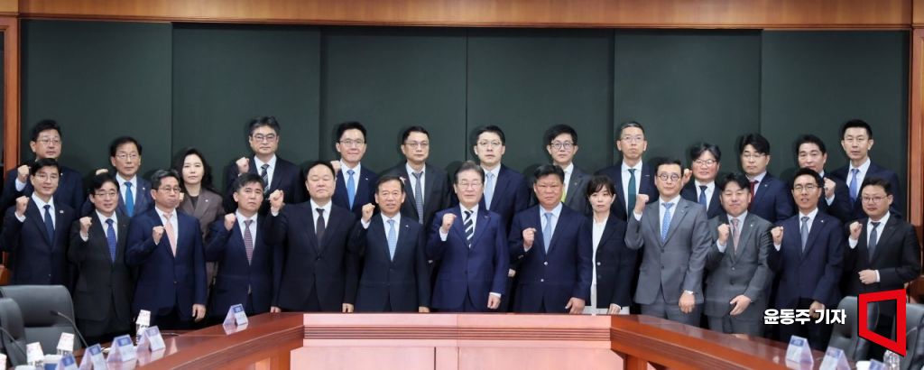 이재명 더불어민주당 대선 경선 후보가 21일 서울 여의도 금투협에서 열린 '자본시장 활성화를 위한 정책 간담회'에 참석, 간담회 시작에 앞서 참석자들과 기념촬영을 하고 있다. 이 후보는 이 자리에서 증권사 리서치센터장들을 만나 한국 증시 현황 및 평가 브리핑을 듣고 시장 선진화 방안에 대한 의견을 교환 했다.