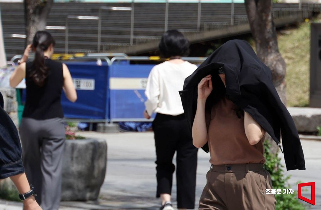 서울 낮 최고기온이 26도까지 올라가며 더운 날씨를 보인 21일 서울 안국동 거리를 걷는 한 시민이 옷으로 얼굴을 가리고 이동하고 있다.
