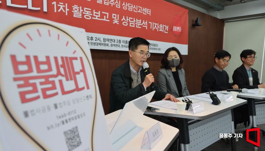 금융소비자연대회의 관계자들이 21일 서울 종로구 참여연대에서 '불불센터 1차 활동보고 및 상담분석 기자회견'을 하고 있다.금융소비자연대회의는 지난 한 달여 동안 '불불센터'(불법사금융·불법추심 상담신고센터)를 통해 접수된 상담 내용을 분석, 제도적 미비점 및 개선방안을 이날 발표했다.