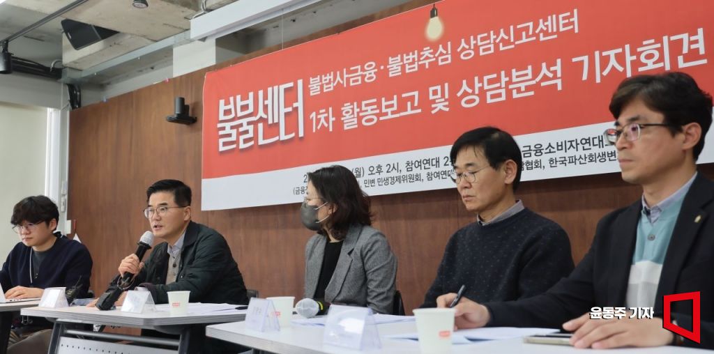 금융소비자연대회의 관계자들이 21일 서울 종로구 참여연대에서 '불불센터 1차 활동보고 및 상담분석 기자회견'을 하고 있다.금융소비자연대회의는 지난 한 달여 동안 '불불센터'(불법사금융·불법추심 상담신고센터)를 통해 접수된 상담 내용을 분석, 제도적 미비점 및 개선방안을 이날 발표했다.
