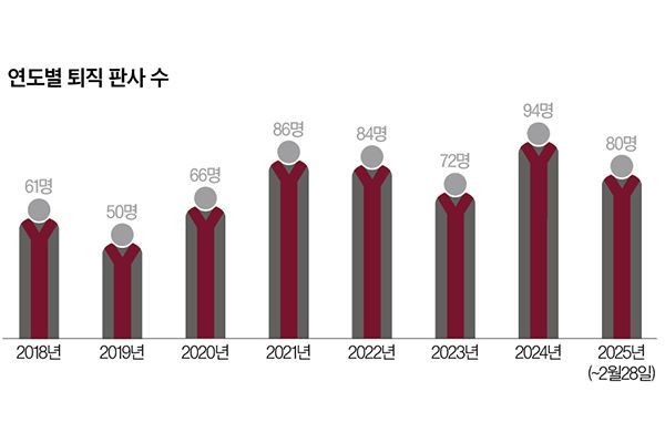 사법행정자문위원회 자료에 따르면 2013년부터 판사 사직자 수는 50~60명대를 유지하다가 2021년부터 70~90명대로 대폭 늘었다. 사직 시점의 평균 연령도 50대 초반으로 나타났다. △2018년 66명(49.6세) △2019년 53명(51.3세) △2020년 68명(47.9세) △2021년 89명(50.4세) △2022년 85명(50.4세) △2023년 78명(53세) △2024년 92명(51.5세)으로 집계됐다.