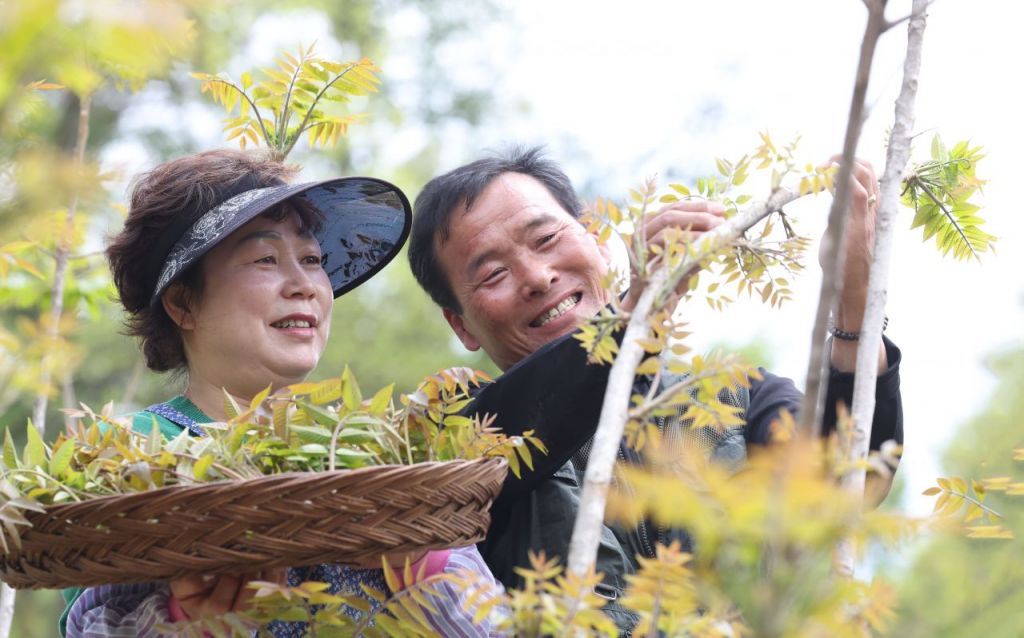 함양군 마천면 의중마을 장철안씨 부부가 봄나물의 으뜸인 옻 순을 따고 있다