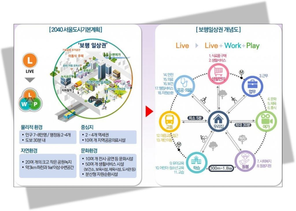 '보행일상권'은 미래공간전략 '2040 서울도시기본계획'(2022년 3월 발표)에서 처음 제시된 것으로 팬데믹·디지털 대전환과 같은 사회적 여건 변화에 따라 주거지의 일상 중심공간 부상 등 생활양식을 반영한 도시공간 개념이다. 멀리 이동하지 않고도 주거지 인근에서 다양한 일상을 누릴 수 있는 자족적 생활권을 의미한다.