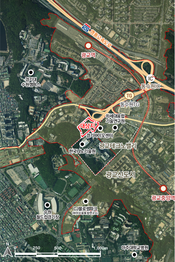 경기주택도시공사(GH)가 경기도경제과학진흥원(GBSA)과 수원 광교테크노밸리 바이오부지 혁신거점 활성화 및 바이오산업 특화를 위한 상호협력에 관한 업무협약을 22일 체결했다. 사진은 위치도. 경기주택도시공사 제공