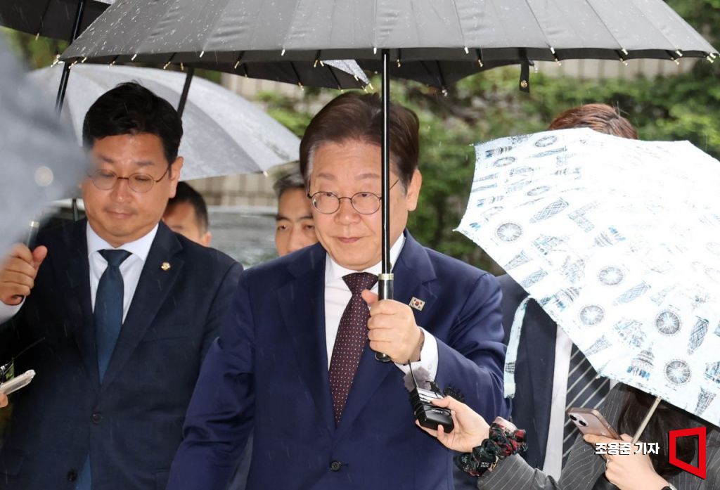 이재명 전 더불어민주당 대표가 22일 서울 서초구 서울중앙지법에서 열린 '대장동 배임·성남FC 뇌물 혐의' 1심 속행 공판에 출석하고 있다.