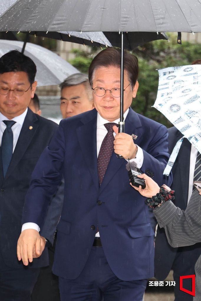 이재명 전 더불어민주당 대표가 22일 서울 서초구 서울중앙지법에서 열린 '대장동 배임·성남FC 뇌물 혐의' 1심 속행 공판에 출석하고 있다.