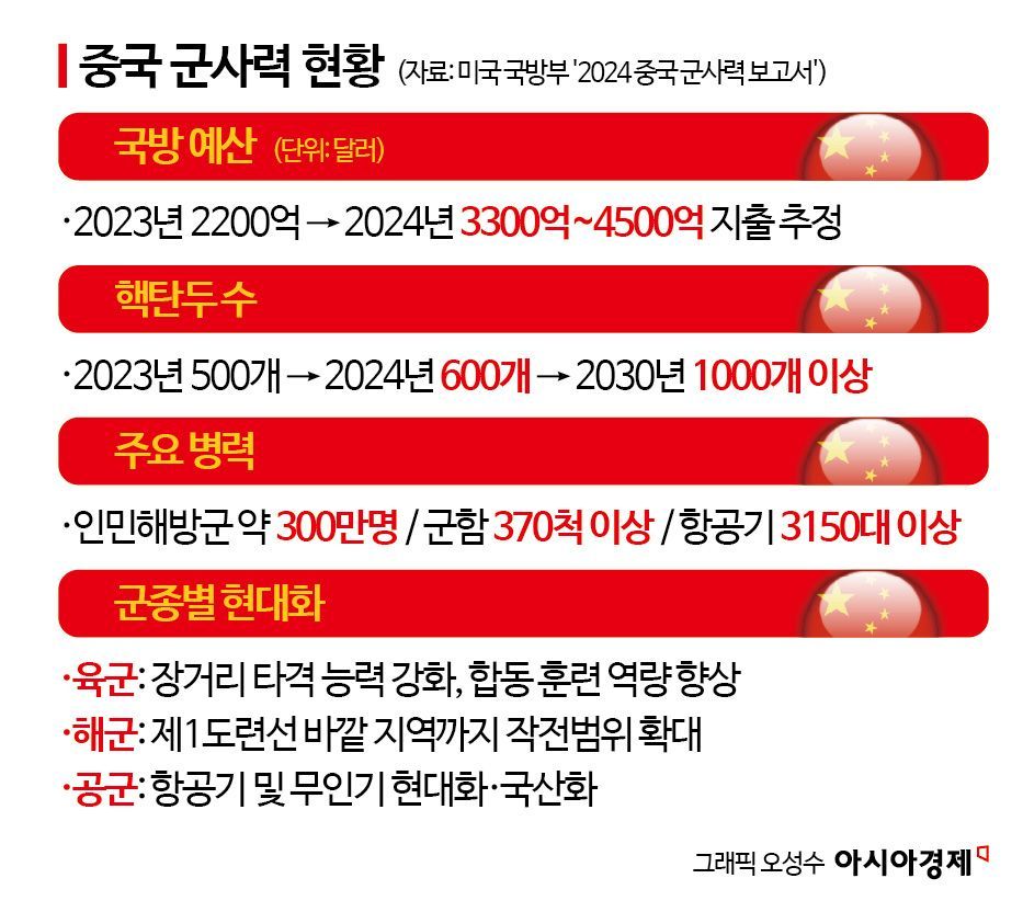 특히 군사적 측면에서 중국은 해군력 팽창을 통해 미국에 큰 위협을 주고 있다. 지난해 미 국방부가 발간한 '2024 중국 군사력 보고서'는 중국 해군이 370척이 넘는 함정과 잠수함을 보유해 세계 최대 규모이며 그 숫자가 올해 395척, 2030년 435척까지 늘 것으로 관측했다. 반면 미 해군은 냉전 이후 자국 조선업체들이 함정 건조·수리 역량에서 경쟁력을 잃으며 지난해 말 기준 295척의 군함을 운용하고 있다. 군함뿐만 아니라 유사시 전략 물자 수송 능력을 좌우하는 국적 상선 보유량도 중국은 7000척 이상에 달하지만, 미국은 200척이 채 되지 않는 것으로 알려졌다.