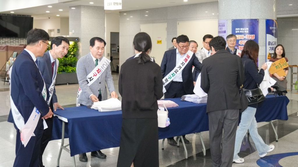 탄소중립 실천주간 행사로 수건등 개인용품을 배부하고 있는 김지철 충남교육감과 관계공무원들