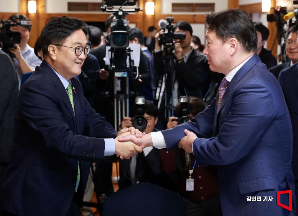 우원식 국회의장과 최태원 대한상의 회장이 22일 국회 사랑재에서 열린 국회 미래산업포럼 발족식에서 인사하고 있다. 김현민 기자